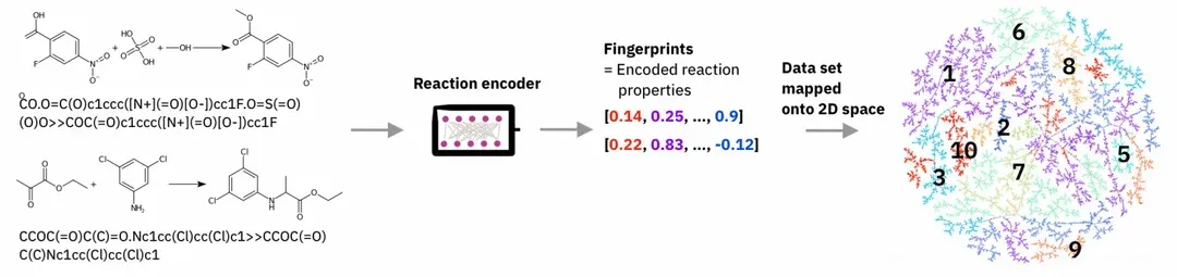 سپس به این نتیجه رسیدیم که می توانیم برای ایجاد یک "اثر انگشت واکنش" از اطلاعات گنجانده شده در مدل های دسته بندی هوش مصنوعی خود استفاده کنیم. اساسن مدل ما هر گونه واکنش شیمیایی را به یک بردار پیوسته تبدیل می کند که به شیمیدانان امکان نقشه برداری فضای واکنش شیمیایی را داده و به آنها اجازه می دهد که به آسانی در مورد واکنش های مشابه تحقیق و پژوهش کنند. این اثر انگشت های واکنش داده محور, امکان نقشه برداری از فضای واکنش بدون دانستن مراکز واکنش و یا شکاف واکنش دهنده-معرف را فراهم می کنند.