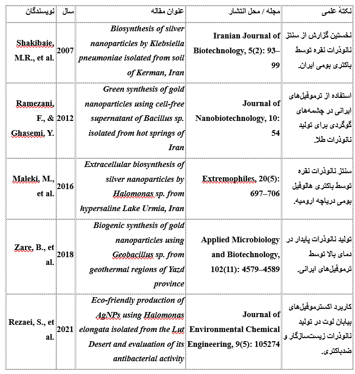 نمونههایی از عبارتهای جست وجو برای یافتن مقالات علمی مرتبط با پژوهشهای ایرانی در زمینه اکسترموفیلها، زیستاستخراج و سنتز نانوذرات: