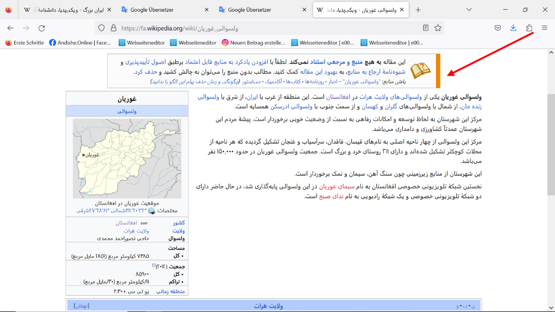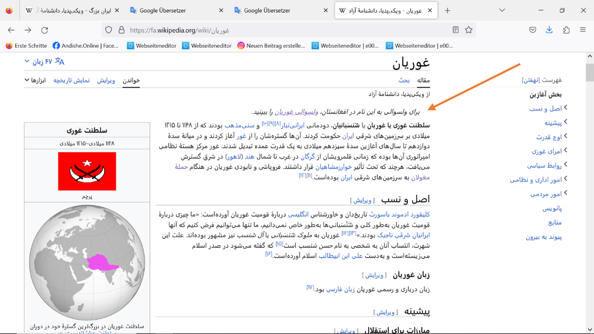 در بالای صفحه مورد بحث، تحریف کنندگان تاریخ، یک لینک به یک صفحه دیگر با تیتر " برای ولسوالی به این نام در افغانستان، ولسوالی غوریان را ببینید" را گذاشته اند (در تصویر فوق با فلش نارنجی مشخص شده است.)