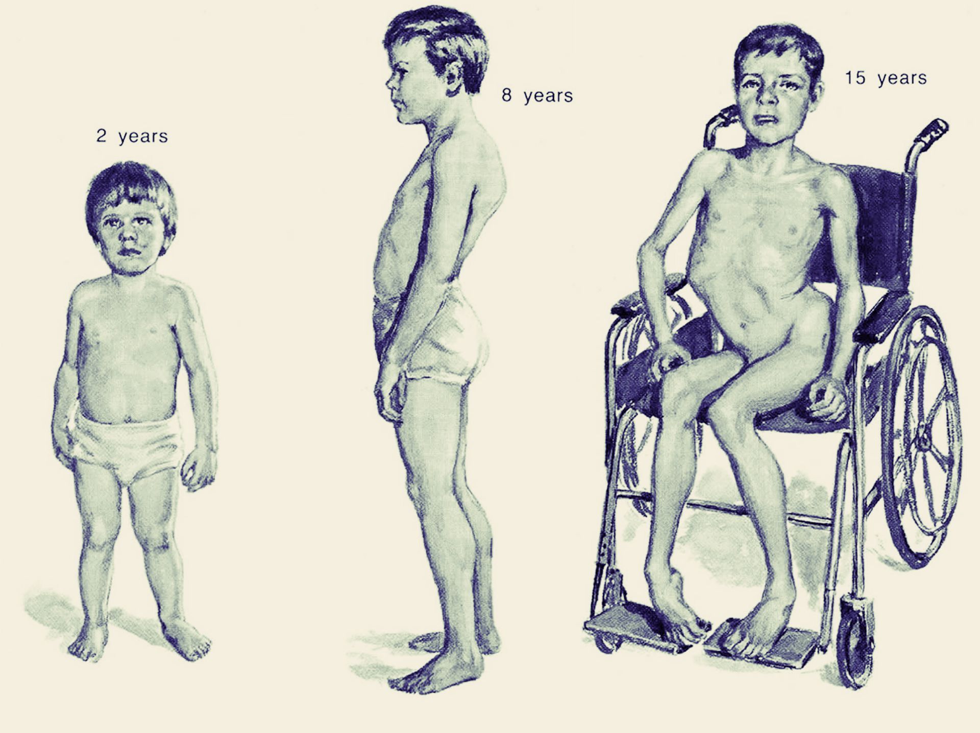 دیستروفی عضلانی. در این مورد خاص در سن پانزده سالگی