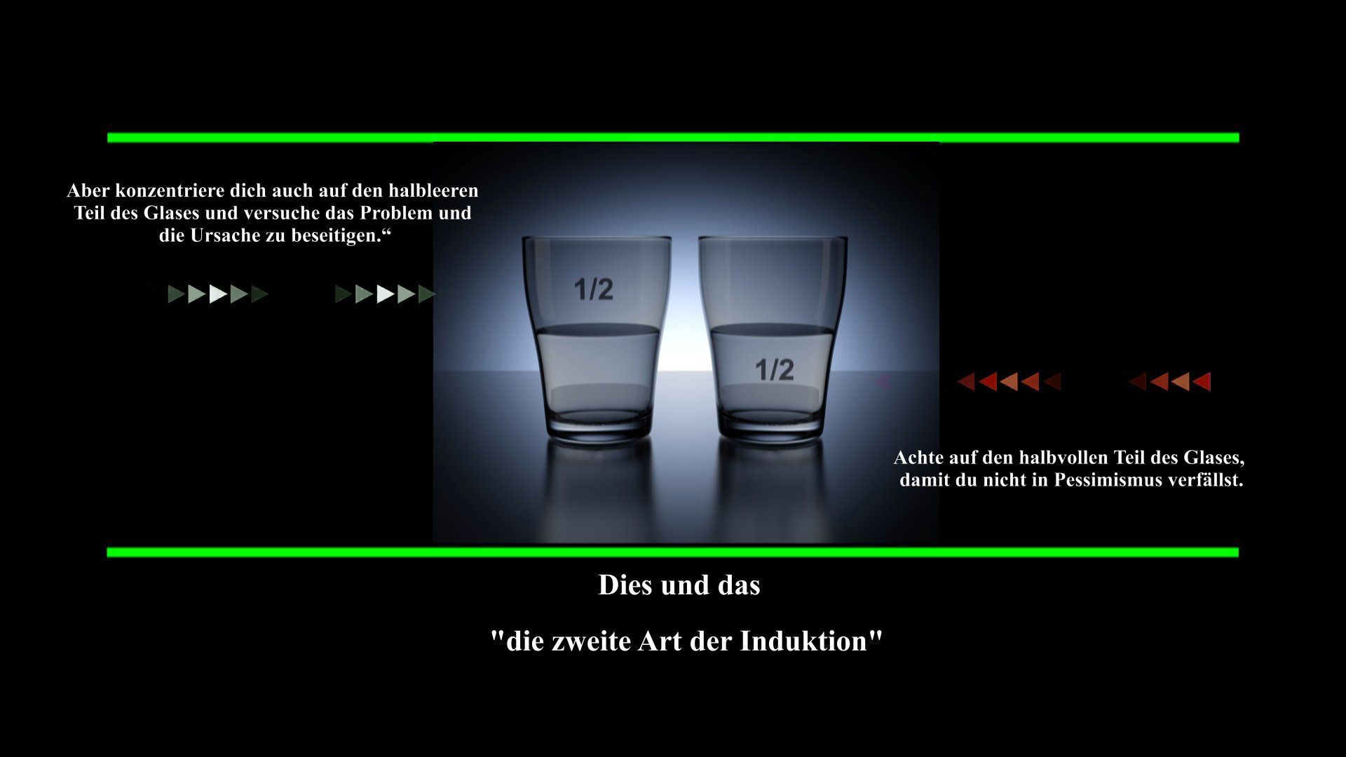 Ich nenne diese Methode "die zweite Art der Induktion" und halte sie für vollständiger als die erste Art der Induktion, d. h. „Achte auf den halbvollen Teil des Glases“, weil diese als eine Motivation dient, die dich dazu bringt, dich noch vollständiger zu machen. Dies ist auch im sozialen Bereich wirksam. Wenn eine Person beispielsweise deprimiert und besorgt ist, weil sie keine Freunde hat, verschreibt der Psychotherapeut die erste Art der Induktion. Das ist gut, reicht aber nicht aus, denn durch die Verschreibung der zweiten Art der Induktion, die wir anbieten, versucht ein Mensch, sich auf seine negativen Punkte zu konzentrieren, die ihn daran hindern, Freunde zu finden, und dann diese Schwächen schrittweise zu beseitigen. Sogar in einem höheren Maße als die Ebene, die die Psyche schon einmal erreicht hat.