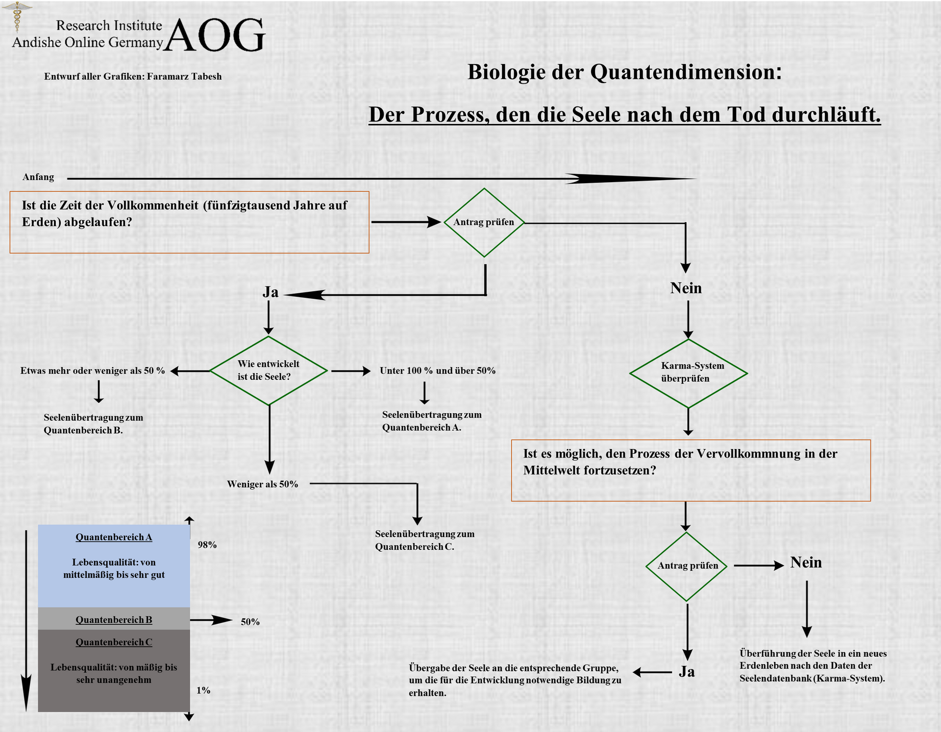 A) Alle Daten des Karma-Systems, die in einer Art Computerfestplatte gespeichert sind, werden von Experten und verantwortlichen Beamten in speziellen Büros für diese Arbeit in der mittleren Quantenwelt sorgfältig untersucht. Man muss natürlich wissen, dass das kleinste Verhalten, der kleinste Gedanke, die kleinste Absicht eines jeden Menschen und im Grunde alles, was aus ihm hervorgeht, im Karma-System seines wahren Selbst gespeichert wird. Gleichzeitig und von dort aus wird ein Bericht darüber an die Personalakte in der Quantenwelt in den gleichen Organisationen gesendet und der Akte hinzugefügt. So haben die zuständigen Mitarbeiter dort Zugang zu den Daten jeder Akte.