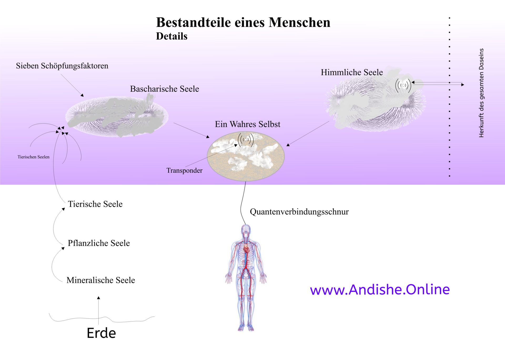- Nach den gleichen Lehren wird der Mensch als ein Wesen mit zwei Polen in seiner Quantendimension definiert. Diese beiden Pole sind das himmlische Magnetfeld (die himmlische Seele) und das baschariche Magnetfeld (die irdische Seele). Aus dem Zusammenwirken dieser beiden Pole entsteht ein ganzheitliches Phänomen, das als „wahres Selbst“ bezeichnet wird.