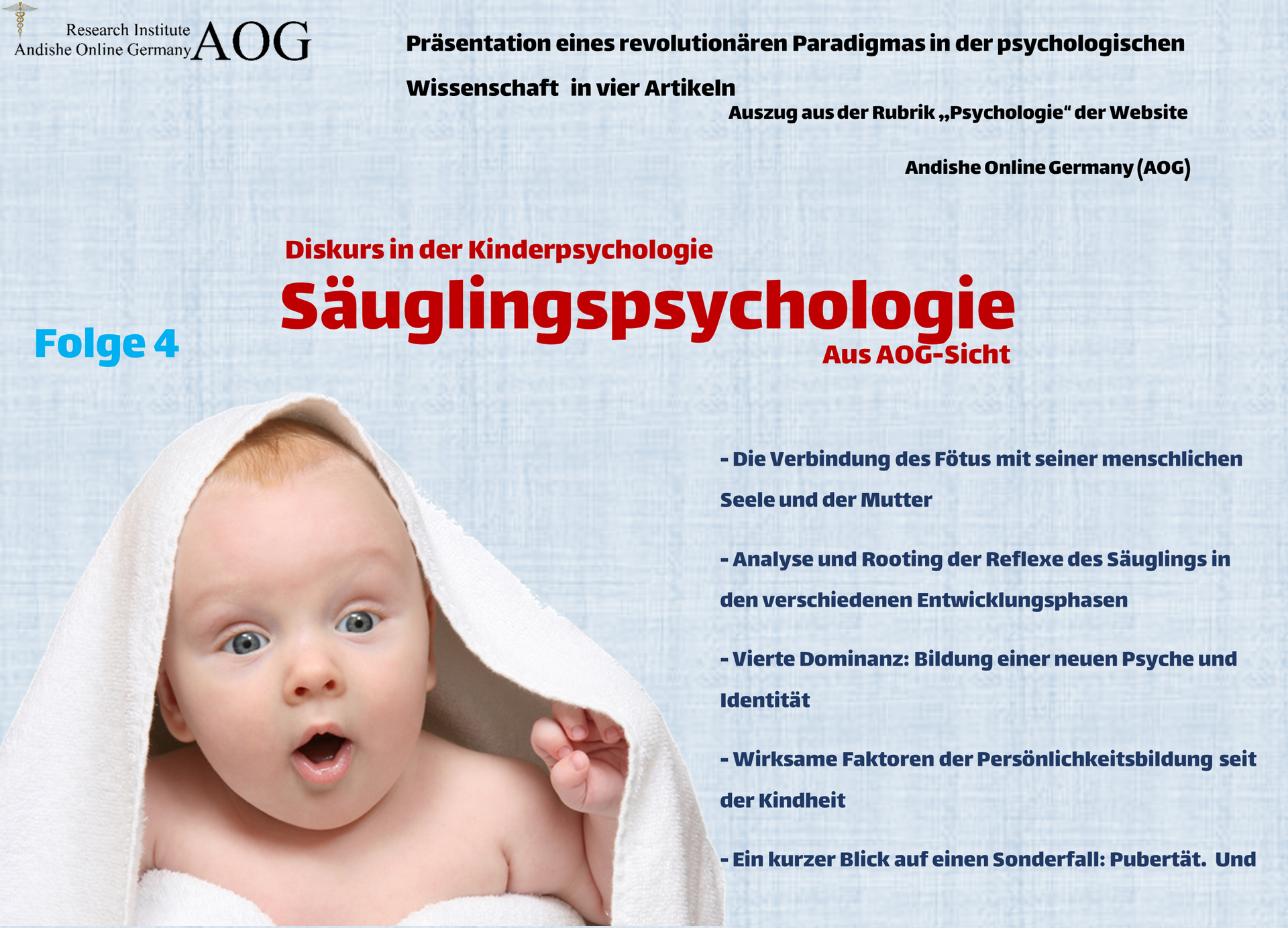 Diese Phase wird als Pubertät bezeichnet, in der sich zwar eine andere Persönlichkeit herausgebildet hat, diese Persönlichkeit aber noch viele Mängel aufweist, deren Korrektur der Prozess der spirituellen Vervollkommnung ist. Interessante Artikel zu diesem Thema finden Sie in der Rubrik „Integrierte Wissenschaften" auf der Website des Forschungsinstituts AOG.
