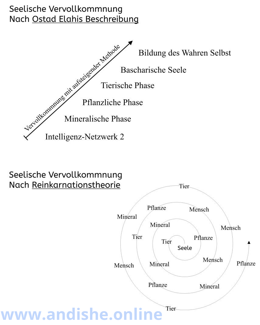 Mit einem tiefen Studium der Lehren von Meister Elahi, kann man leicht erkennen, dass das, was uns die Lehren von Meister über die Vollkommenheit der Seele anbieten, völlig anders ist als die Reinkarnationstheorie oder ähnliche Thesen und während dies nicht die üblichen Mängel der Reinkarnation aufweist, ist es in der Lage, logisch, vernünftig und wissenschaftlich alle Stufen der seelischen Vollkommenheit zu beschreiben.
