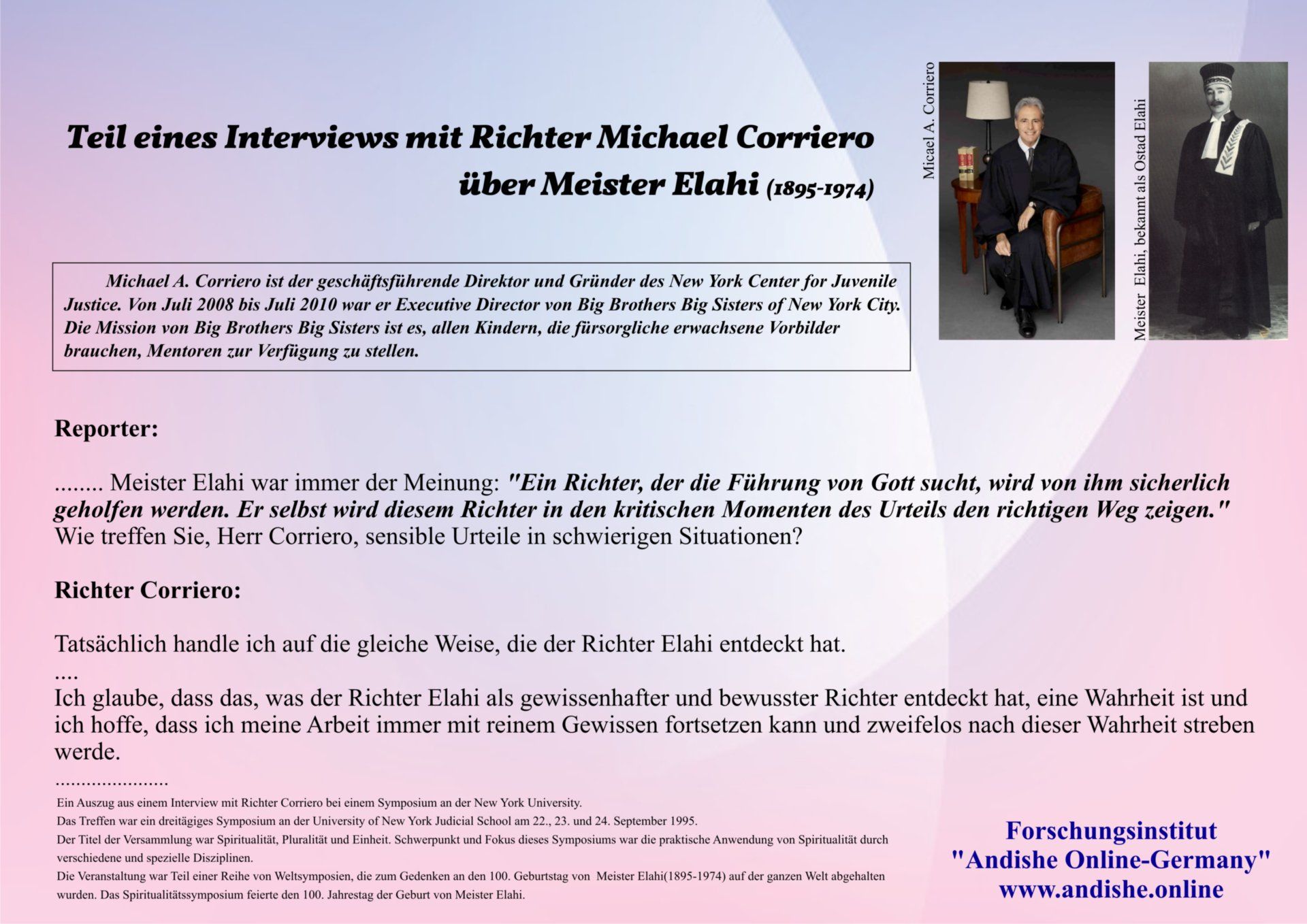 Richter Michael A. Corriero war damals Leiter der Jugendabteilung des New Yorker Gerichts und später Zusatz Professor an der Pace University in den USA. Inmitten der oben erwähnten Symposien beantwortete er eine Frage, die zur Urteilsmethode von Meister Elahi im Gerichtssaal gestellt wurde und damit hat er diese Methode bestätigt und betont, dass er selbst dieselbe Methode anwendet.