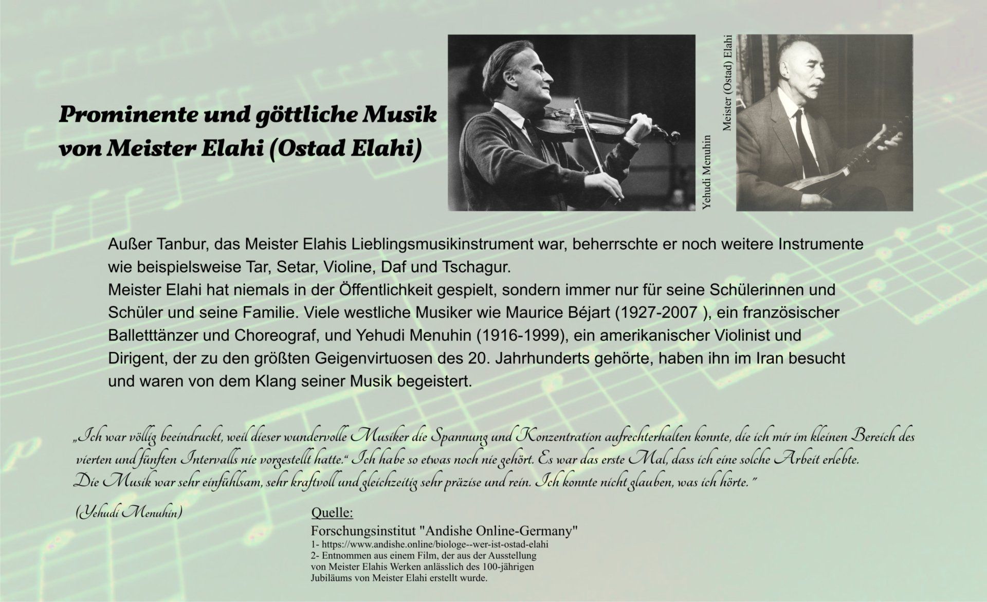 Es genügt daher, ein Beispiel aus dem Buch "Der Geist der Klänge: Die einzigartige Kunst von Ostad Elahi (1895-1974)" [1] anzuführen. Dies ist eigentlich eine Forschungsarbeit über die himmlische Musik von Meister Elahi von Professor Jean Doering, Forschungsdirektor am Nationalen Forschungszentrum der Universität Sorbonne in Frankreich, einem Vertreter des französischen Musikvereins der Nationen und Professor an der Universität Straßburg.