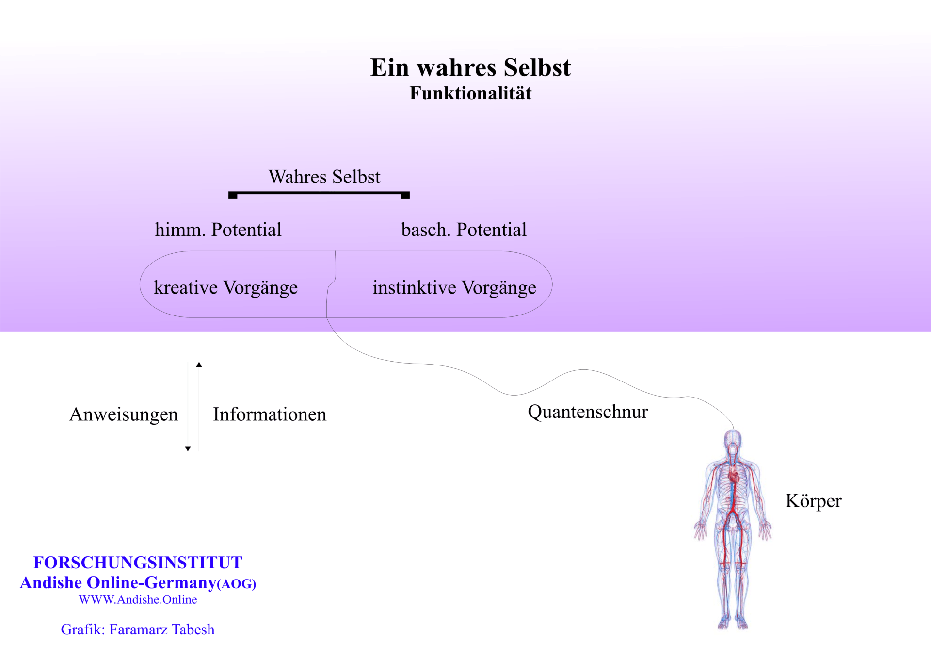 Tatsächlich wird jede Information von den Organen des Körpers oder von der Umgebung durch den Cortex und durch die Quantenschnur an das wahre Selbst gesendet. Dort wird jede Information von den beiden Teilen des Selbst, nämlich von dem menschlichen (bascharichen) - und dem himmlischen Potenzial analysiert. Anschließend wird nach einem sehr komplizierten Prozess eine passende Anweisung vorbereitet und zum Cortex zurückgesendet.