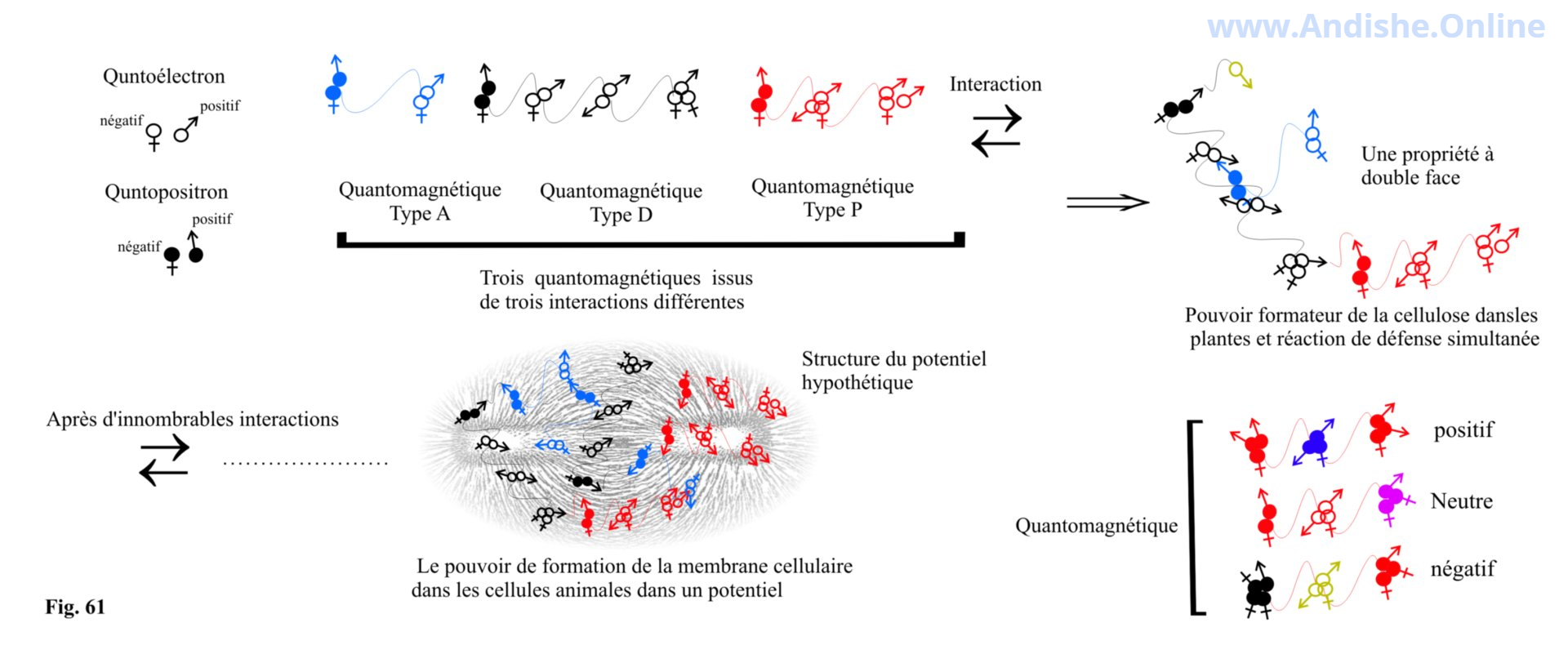 Dans le cas des fermions, les Quantoelectrons prédominent, tandis que dans celui des antifermions, ce sont les Quantopositrons. Les qualités mentales perçues comme positives ou négatives émanent de ces Quantomagnets.