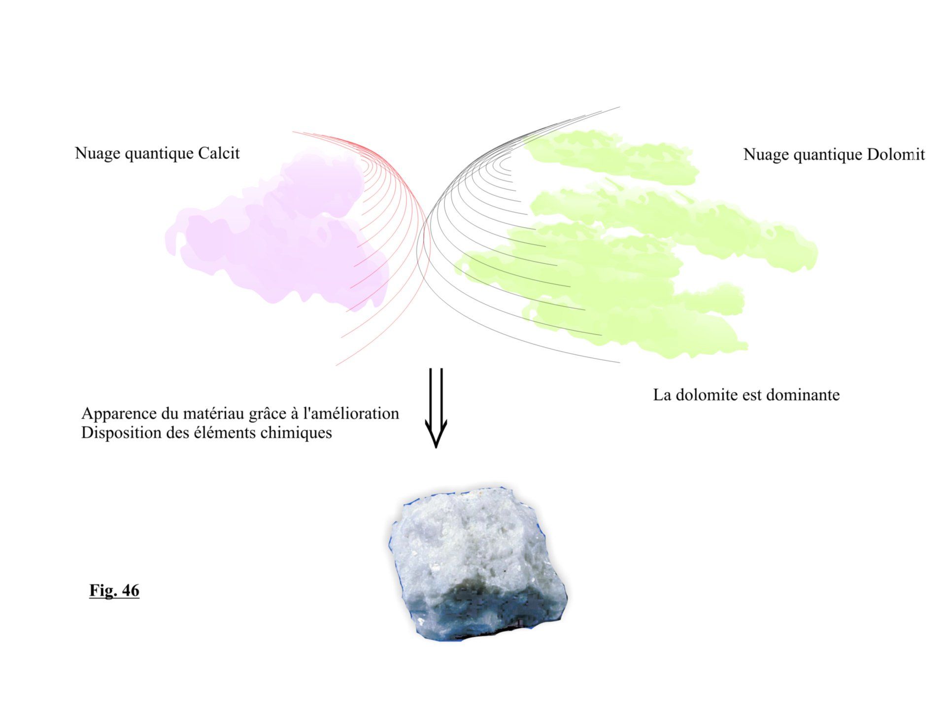 Le nuage quantique de CaCO3, qui résulte de très longues interactions et d'un échange d'informations entre cinq nuages plus faibles (3 fois -O & -Ca & -C) de deux groupes (CaO & Co2), est fondamentalement un potentiel qui se caractérise par une tendance à progresser et la recherche d'un état plus stable. Afin de satisfaire cette forte tendance instinctive, il se combine avec un potentiel issu d'un processus de maturation similaire, c'est-à-dire l'expérience magnétique (âme) de la dolomie (CaMg (CO3) 2), qui cherche également un moyen de constituer une structure plus stable pour assurer la stabilité de l'ensemble du système.