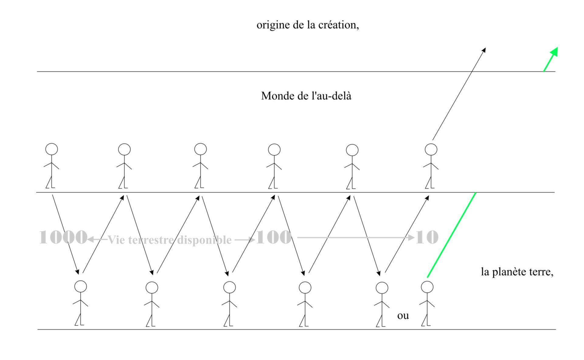 Dans ce contexte, il convient de rappeler qu'au début de la création, chaque âme a la possibilité d'atteindre la perfection spirituelle pendant cinquante mille années terrestres. Étant donné que la somme de deux vies terrestres doit s'élever à 100 ans, il en résulte que chaque âme dispose de 1 000 vies terrestres, et comme elle doit passer par mille étapes spirituelles, il est facile de voir qu'en moyenne, pour chaque vie terrestre, elle doit accomplir au moins une étape spirituelle comprenant quarante rangs (positions) spirituels.
