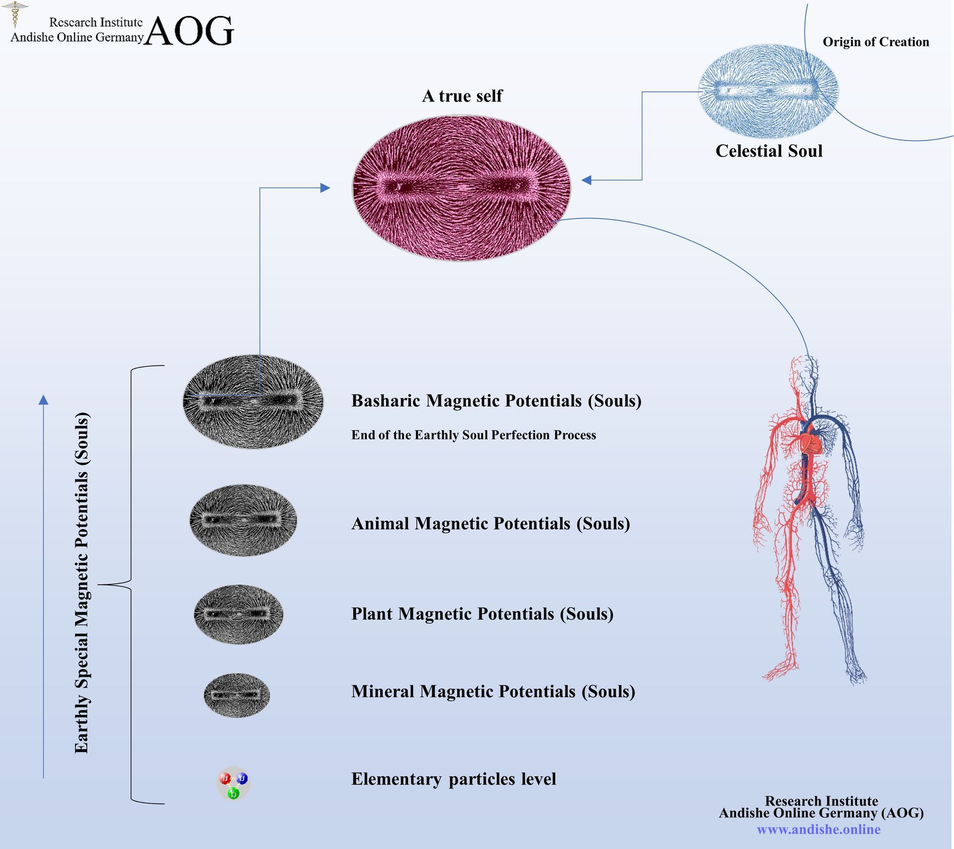 The Research Institute AOG, on the other hand, based on the information provided by Master Elahi, considers the creature that exists immediately after conception to be "Bashar" with the definition described above. This assertion is based on the fact that this creature has only one pole in the quantum dimension. Furthermore, the soul discussed can be defined as a magnetic field full of information called the basharic (earthly) soul.
