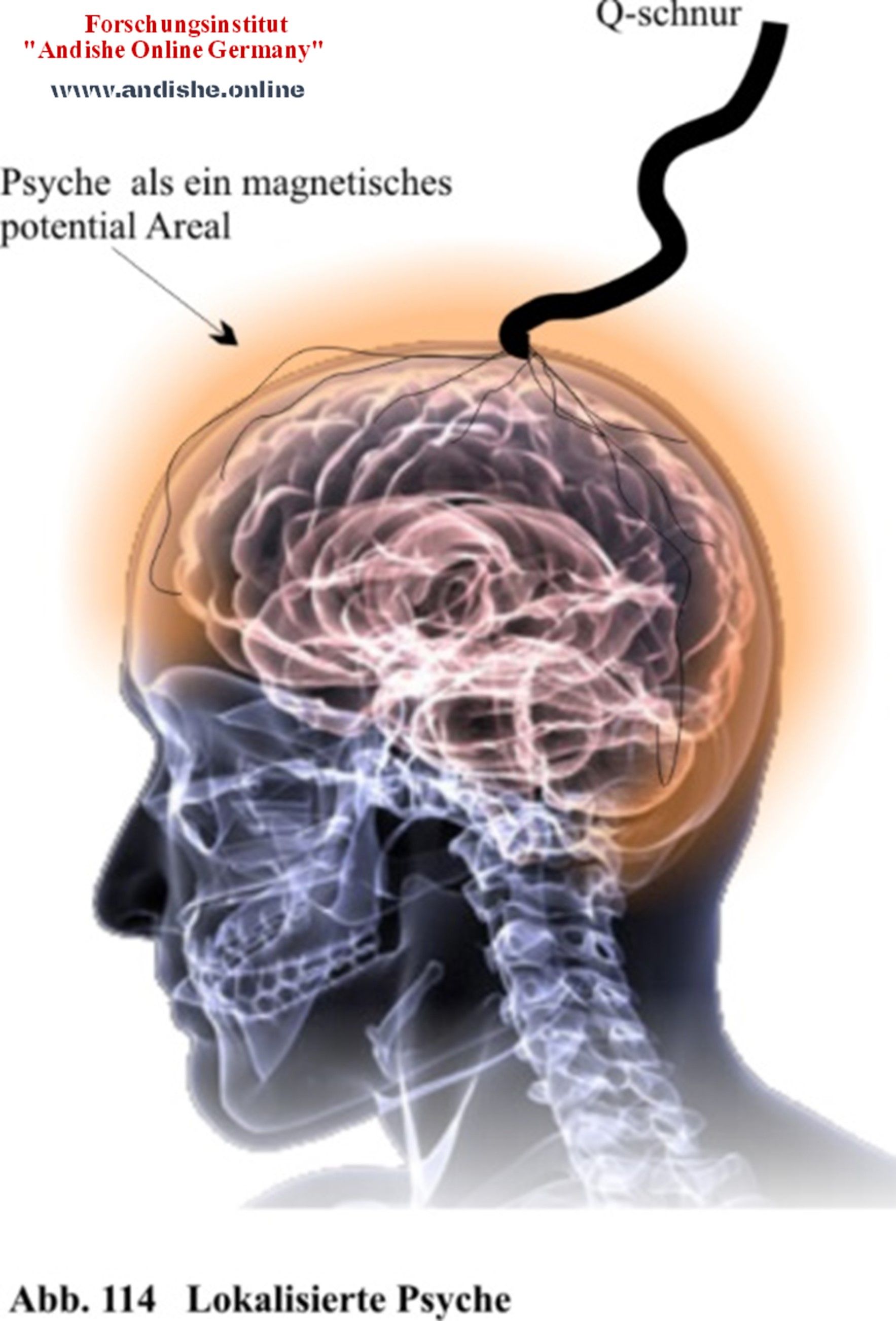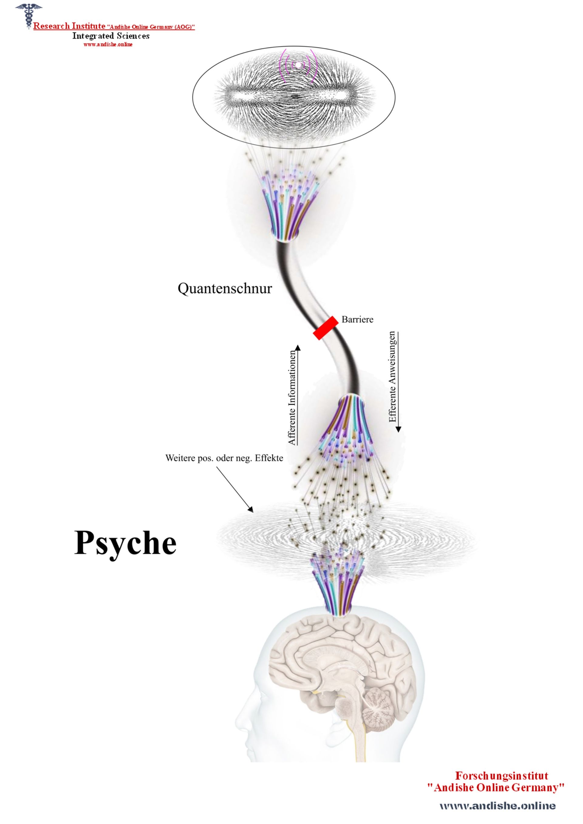 Hier möchte ich Sie von komplizierten Definitionen, die von Psychologen vorgelegt werden verschonen, da man diese in jedem psychologischen Buch finden kann. Hier können wir aber mit der Berücksichtigung der Seelenanalysen, die wir durchgeführt haben, unsere eigene Definition von Psyche präsentieren. Wie schon besprochen, verläuft an der Grenze zwischen den basalen Fortsätzen der Q-schnur und den apikalen Fortsätzen der Dendriten der Neuronen, eine kontinuierliche Kommunikation. Diese Grenze haben wir CC, oder Zentral - Zentromer genannt, wo die sensorischen Informationen in einer spezifischen Energie und umgekehrt umgewandelt werden. Mit diesen Überlegungen können wir jetzt zum ersten Mal die Psyche tatsächlich wie folgt lokalisieren: