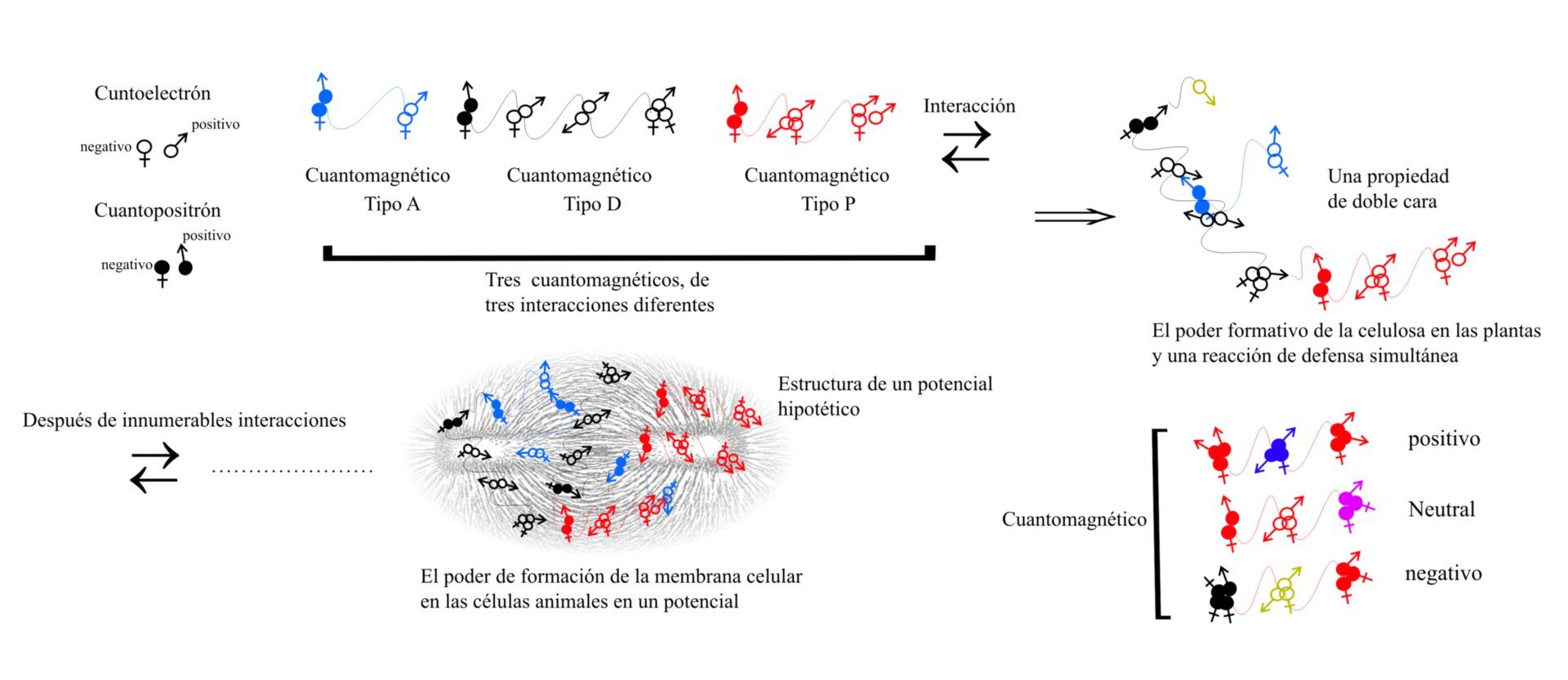 En el caso de los fermiones, predominan los Quantoelectrons, mientras que en los antifermiones, predominan los Quantopositrons. Las cualidades mentales percibidas como positivas o negativas provienen de estos Quantomagnets.