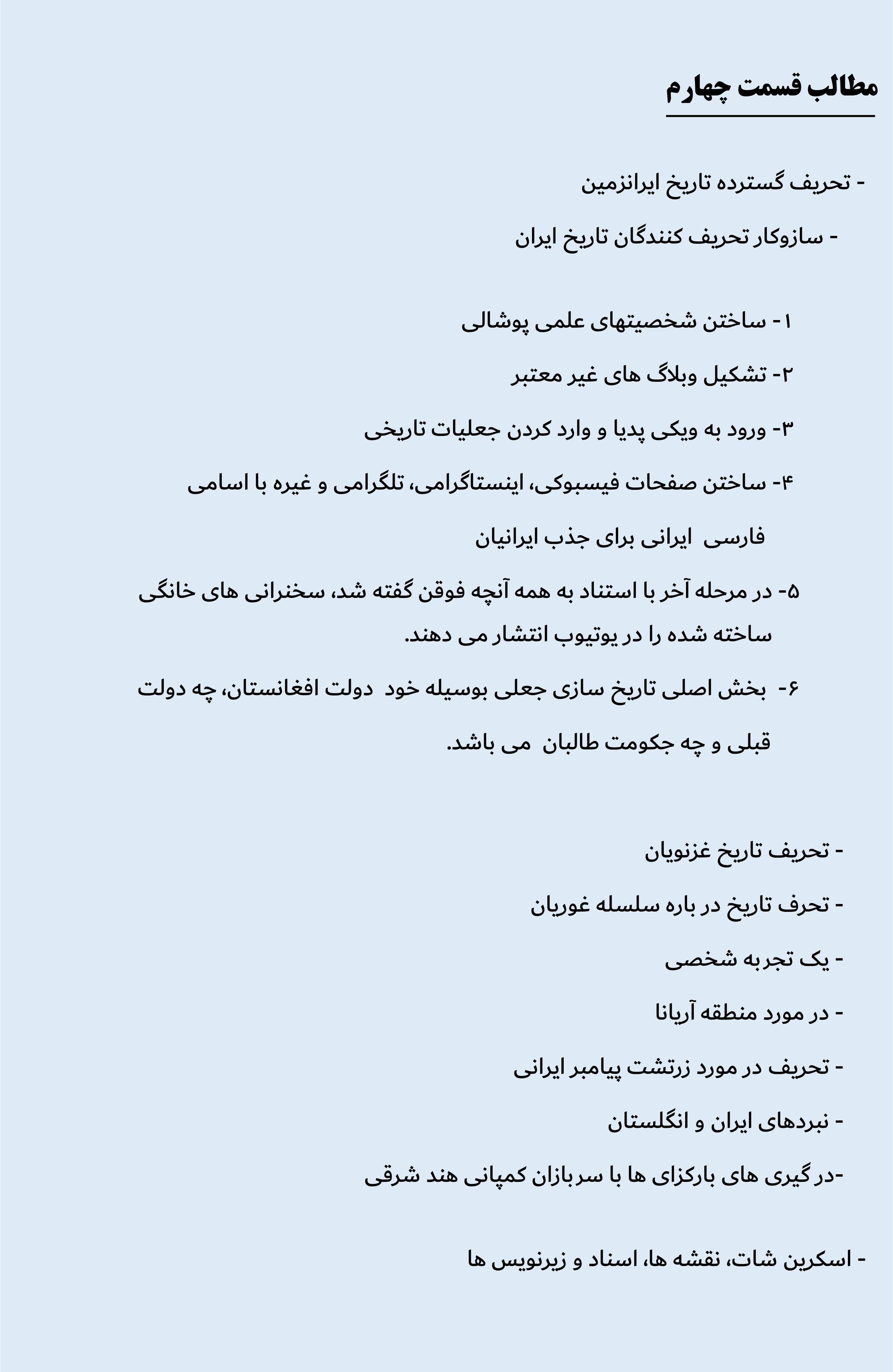 در واقع کار تحریف تاریخ ایرانزمین از سالها پیش کلید خورده، اما از یک تا دو سال پیش شدت یافته و امروز به اوج خود رسیده است. با بررسی دقیق و تدقیق در سندهای موجود و انطباق آنها با یکدیگر به این نتیجه رسیدم که یک تیم هشت تا ده نفره و با حمایت مالی بیگانگان، احتمالن همان سورس های مالی که شبکه های تلوزیونی فارسی زبان ایرانی مخالف ملی گرائی و نیز شاخه افغانستانی آن را تأسیس کرده اند، دست بکار تخریب و مخدوش ساختن اطلاعات صحیح مربوط به تاریخ ایران شده اند. اسامی چند نفر از آنها نیز مشخص شده است که البته در این مقاله قصد بازگفت آن را ندارم تا مسئله شخصی نشود.