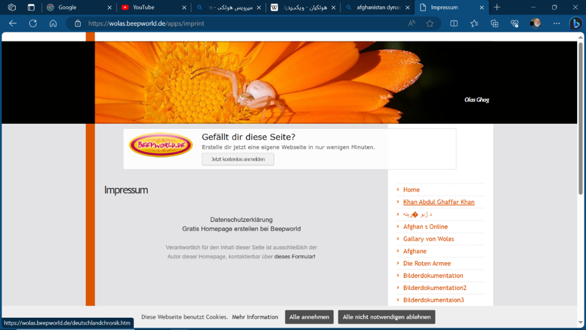 در صفحه Impressum همانطور که در اسکرین شات زیر قابل مشاهده است هیچگونه اطلاعات از ارائه دهنده این وبلاگ موجود نیست. جالب آنجاست که ویکی پدیا چنین وبلاگ جعلی را به عنوان سند آن صفحه در مورد میرویس پذیرفته و آن را حذف نکرده است.