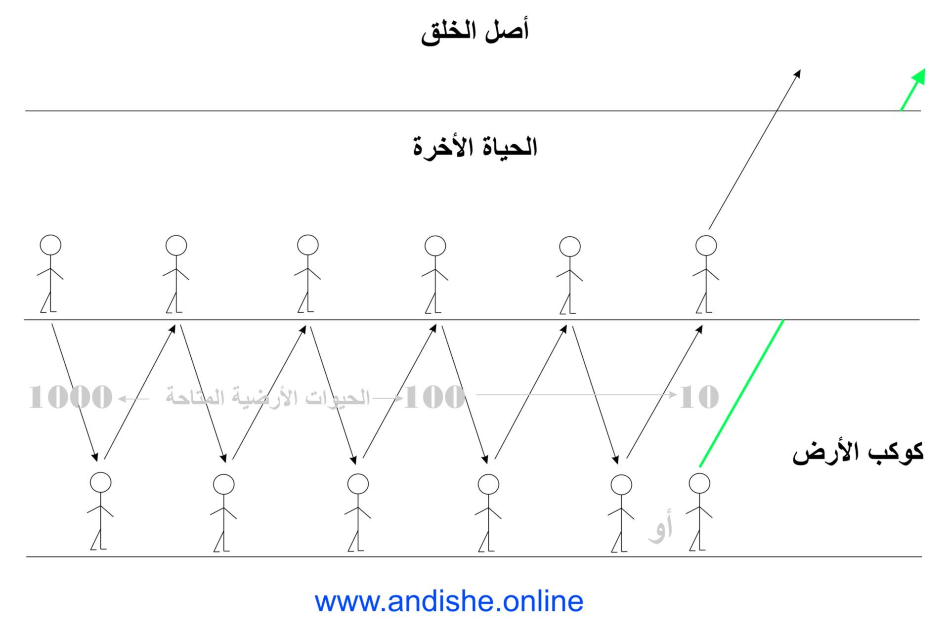 س ٥٠٠٠٠ سنة (الوقت اللازم لبلوغ الكمال) مقسمة على متوسط ٥٠ سنة من الحياة في حياة واحدة (لأن كل حياتين على الأرض يجب أن تكون ١٠٠ سنة) = ١٠٠٠ حياة أرضية متاحة لكل إنسان لإكمال عملية الكمال.س