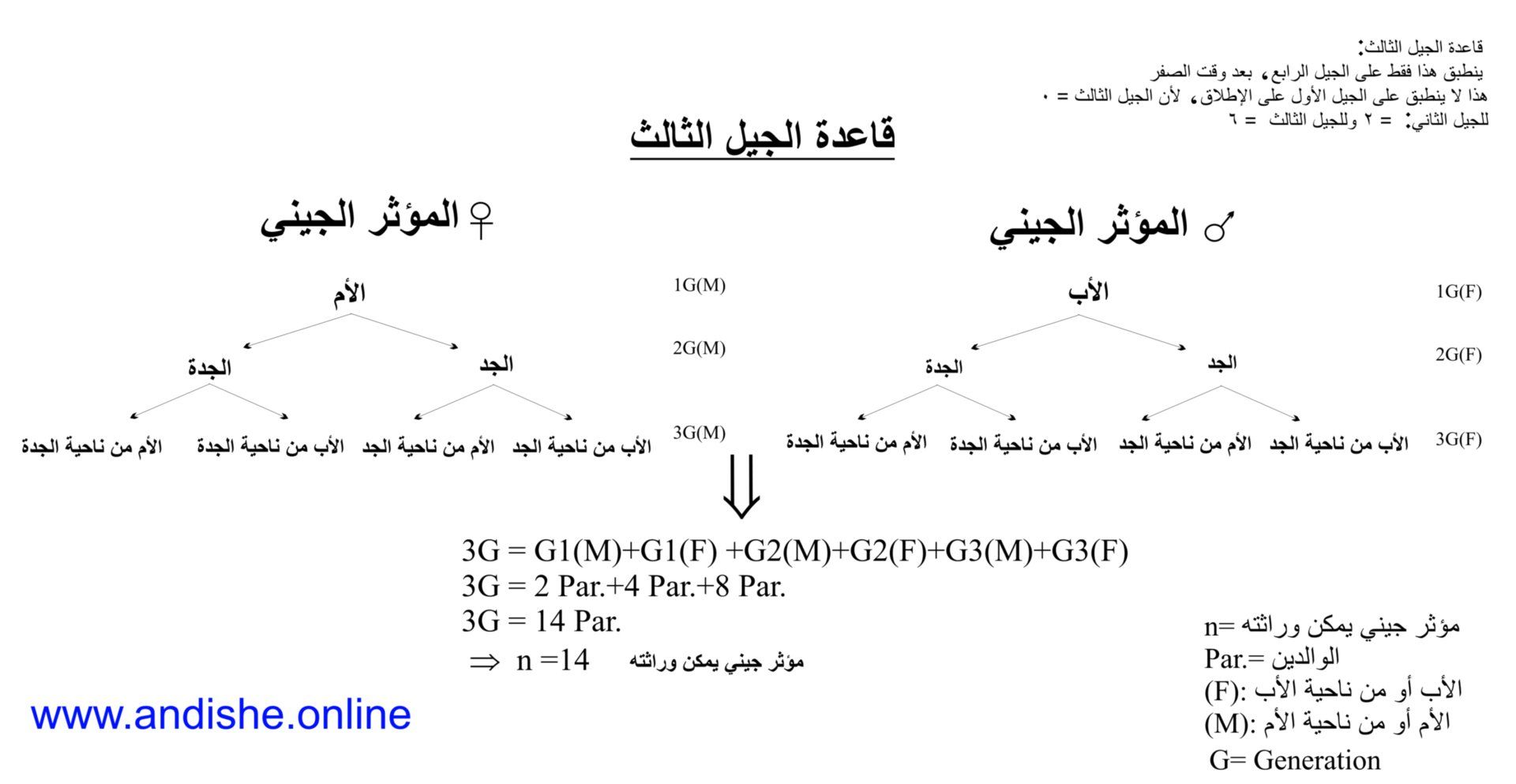 س ١- التأثيرات الجينية للأجيال الثلاثة الأخيرة للطفل، كالأب والأم، وكذلك الأبوين والأجداد على كلا الجانبين. هذا في المجمل ١٤ شخصًا. هذا ما نسميه قاعدة الجيل الثالث، أي قاعدة الجيل الثالث. س