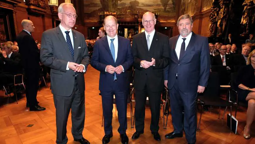 از چپ به راست: توماس اشتووه (استاد ناحیه- [شهر هامبورک])، اولاف شولتز( اولین شهردار شهر هامبورگ و صدر هیئت رئیسه فعلی آلمان)، پروفسور دکتر نوربرت لامرت( بوندس پرزیدنت در سال ۲۰۱۷ و از سال ۲۰۱۸ ریاست بنیاد کونراد آدِناور)، پروفسور دکتر اشتفان روت کلییر(یکی از استادان اعظم).